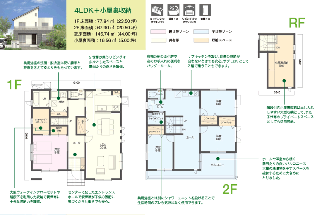 リビングやキッチンなど基本的な生活空間をすべて共有し、二世帯が一緒に暮らす古き良き日本のスタイルです。建築コストやランニングコストが一番抑えられます。 プライベート空間を別に確保したりミニキッチンを設置するなど汎用性を高め、時にはゆずり合えるようにしましょう。